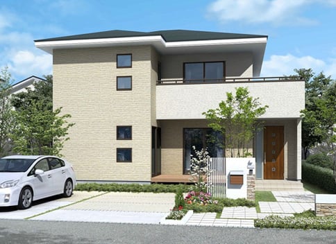 砂岩調のアースカラーとホワイトを上下に張分け、ブラウンのサッシや屋根でさらに統一感をもたせた、落ち着きのある外観です。 周囲との調和や飽きのこないデザインをお考えのご家族におすすめです。